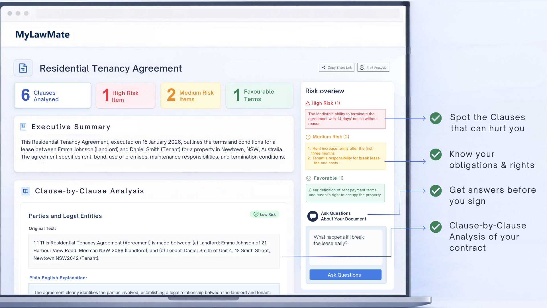 MyLawMate scans your document, highlights key clauses and explains what they mean in everyday language.
